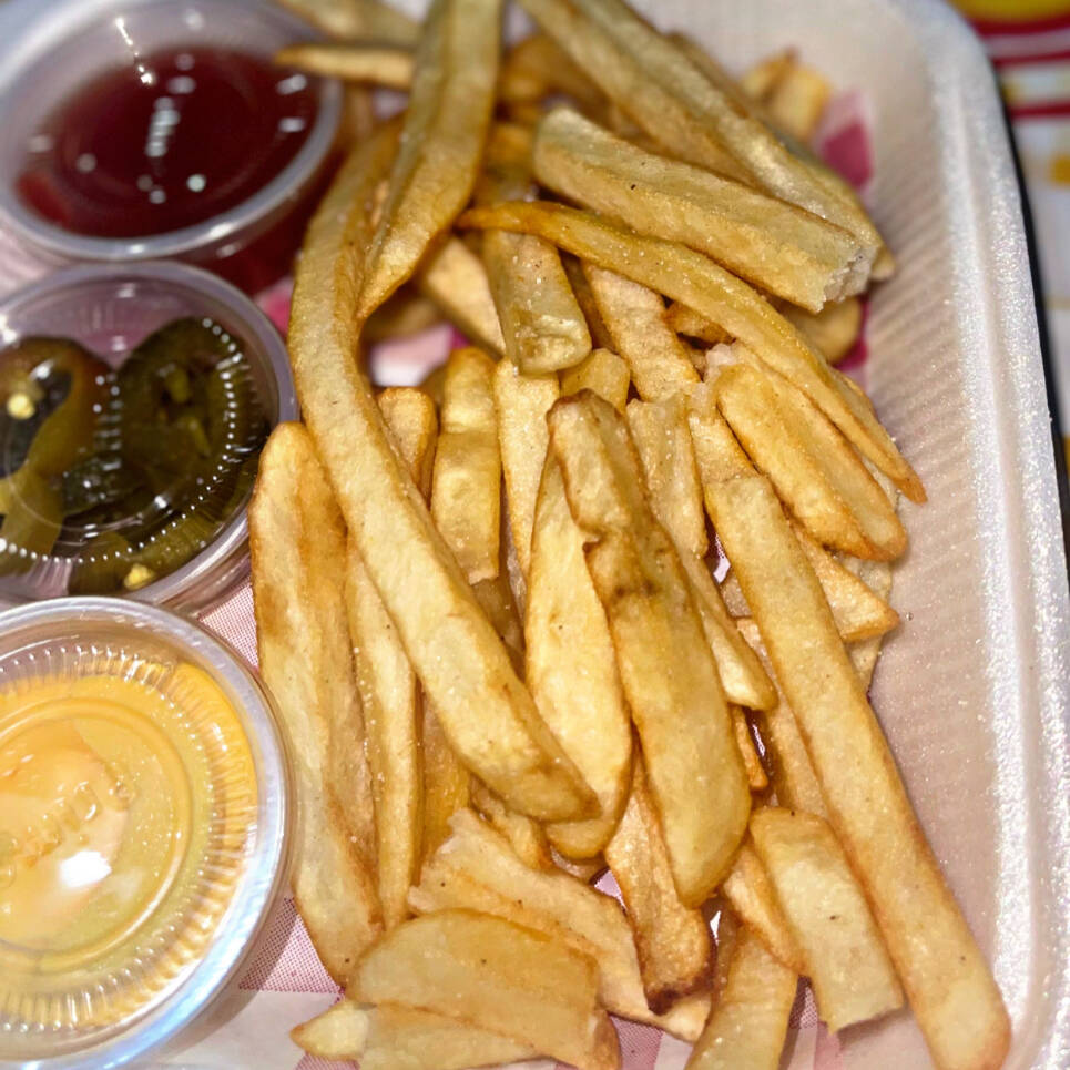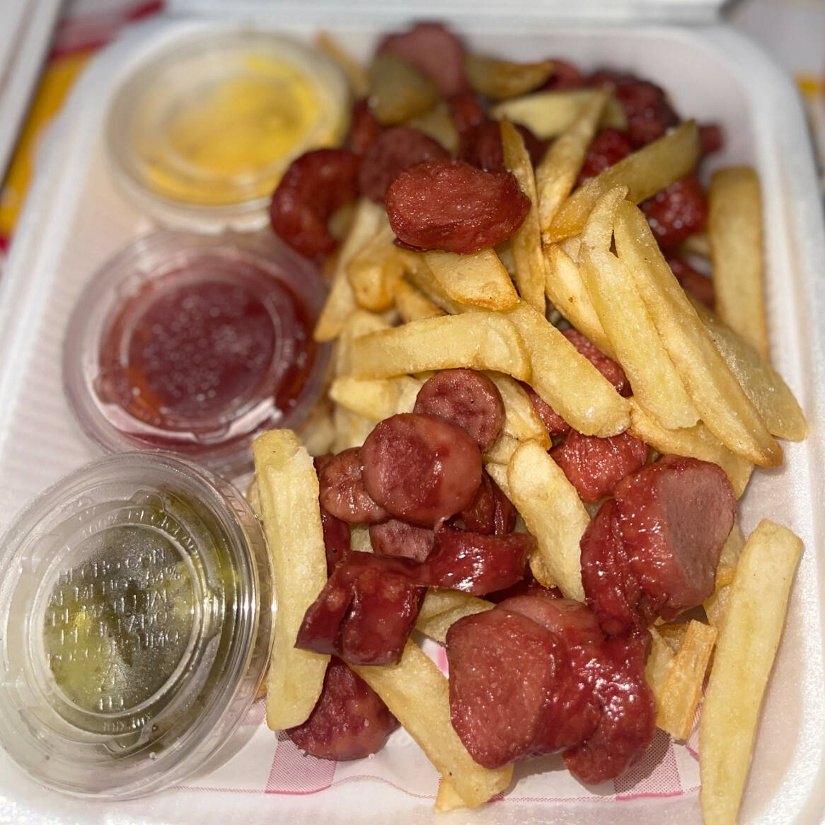 Crujientes Papas francesas 200 gr en compañia de salchichas de pavo doraditas. Recipientes individuales :Capsu,queso amarillo y chile en vinagre.