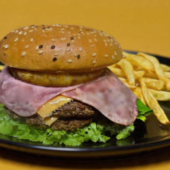 Déjate deleitar por carne de res artesanal 300 gr , doble rebanada de jamón de pavo , piña con BBQ , doble rebanada de queso amarillo ,lechuga italiana y tomate , pan de ajonjolí en compañía de 150 gr de papas francesas . Recipientes individuales : capsu, mostaza y chile en vinagre