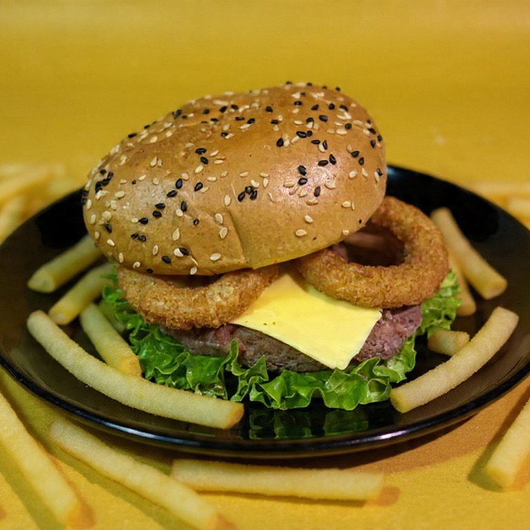Déjate deleitar por carne de res artesanal 300 gr ,triple aro de cebolla con BBQ , doble rebanada de queso amarillo ,lechuga italiana y tomate , pan de ajonjolí en compañía de 150 gr de papas francesas . Recipientes individuales : capsu, mostaza y chile en vinagre