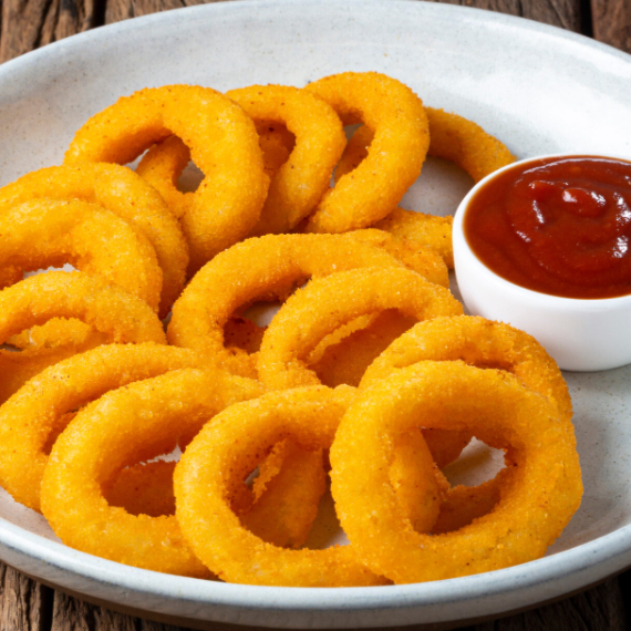 Disfruta de una orden de aros de cebolla (10 piezas).Complemento en recipientes individuales: Capsu y Queso Amarillo