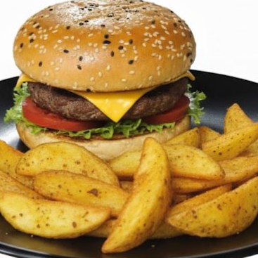 Disfruta una hamburguesa 100% carne de res, jugosa y con preparación artesanal, servida en un suave pan con ajonjolí . Acompañada de lechuga italiana fresca, tomate y cebolla cuidadosamente desinfectados, para ese toque perfecto de frescura.Incluye 150 g de papas gajo crujientes ,catsup, mostaza y chile en vinagre para que disfrutes a tu gusto.