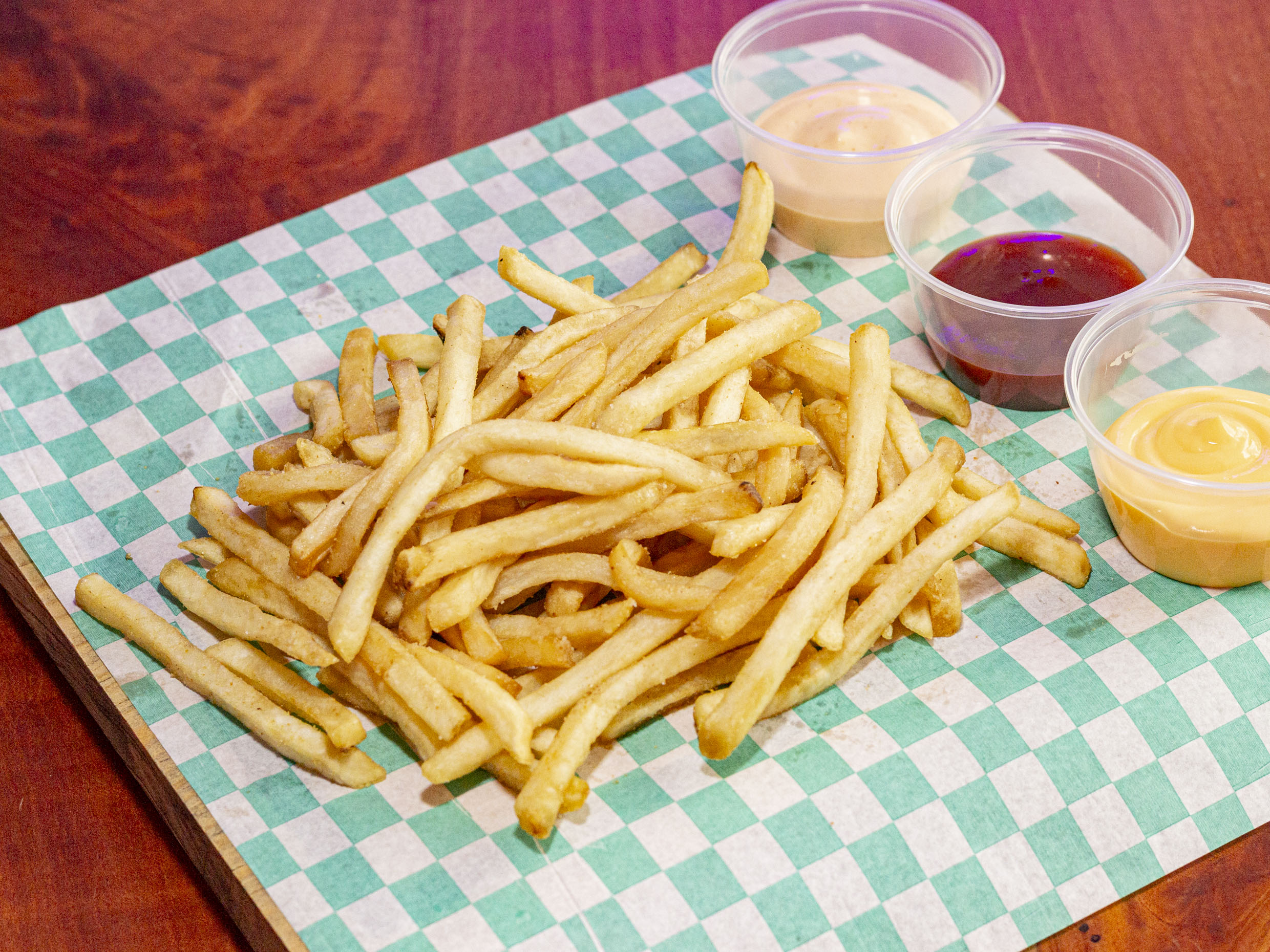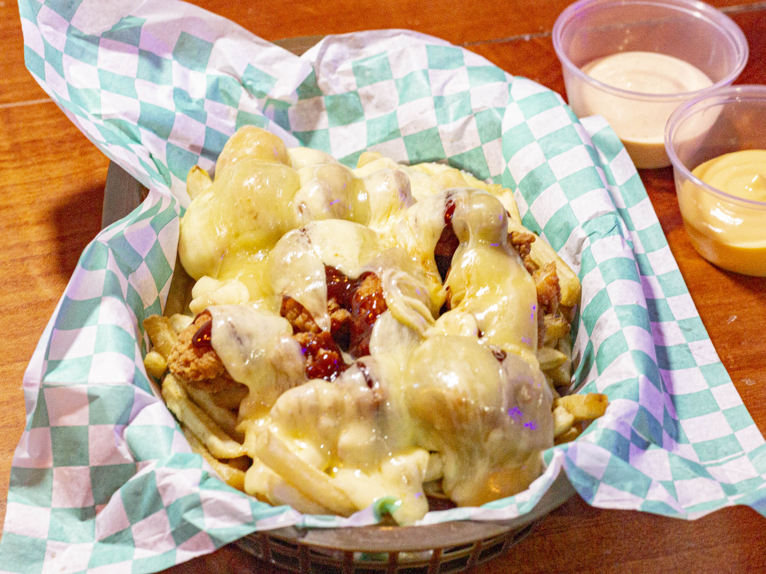 Papas a la francesa con boneless bbq y gratinadas con queso gouda.