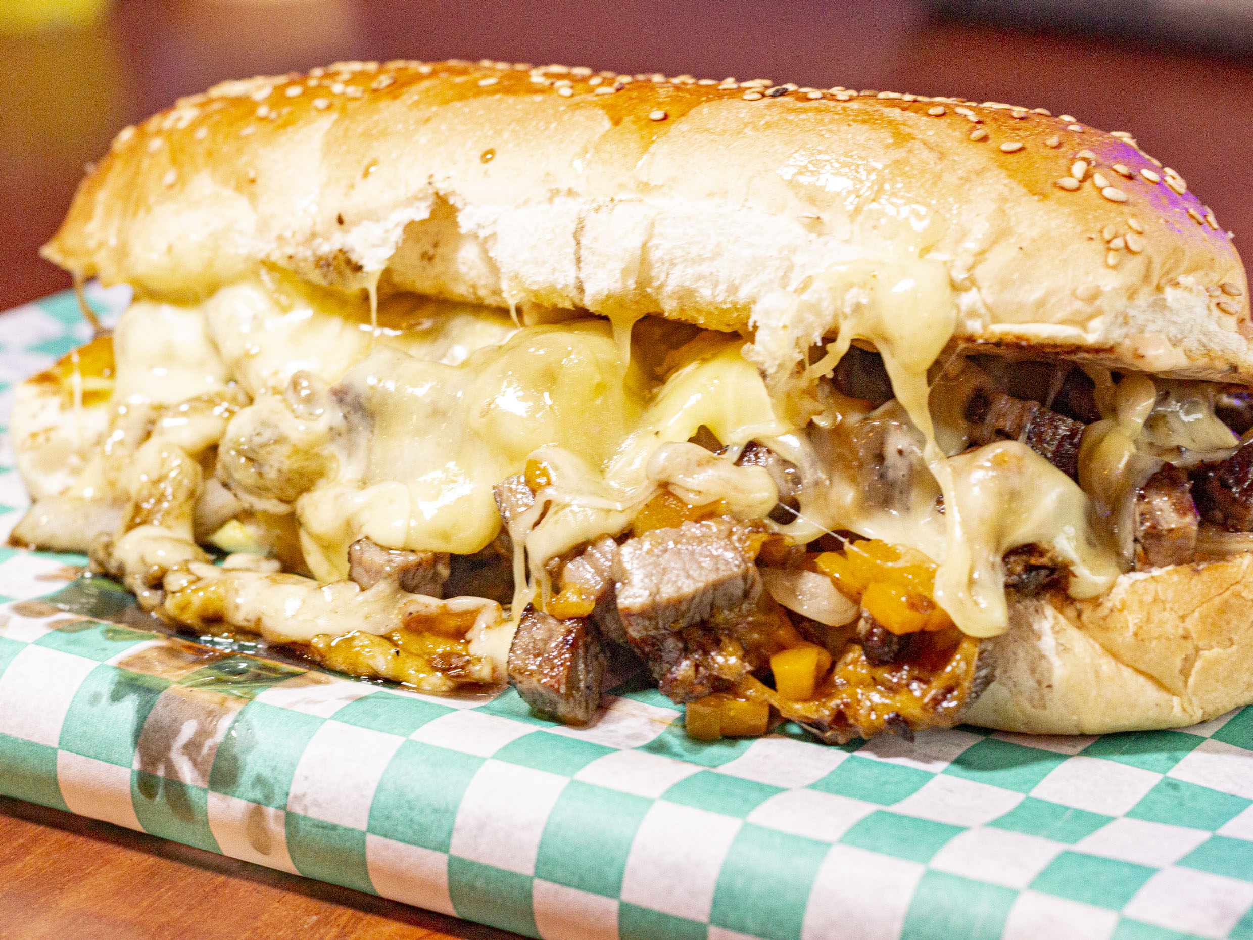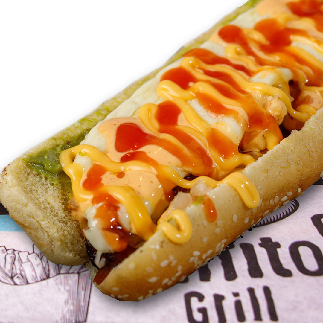 Salchicha de res jumbo, guacamole, piña asasda, cebolla, tomaste, aderezos y queso gouda gratinado.