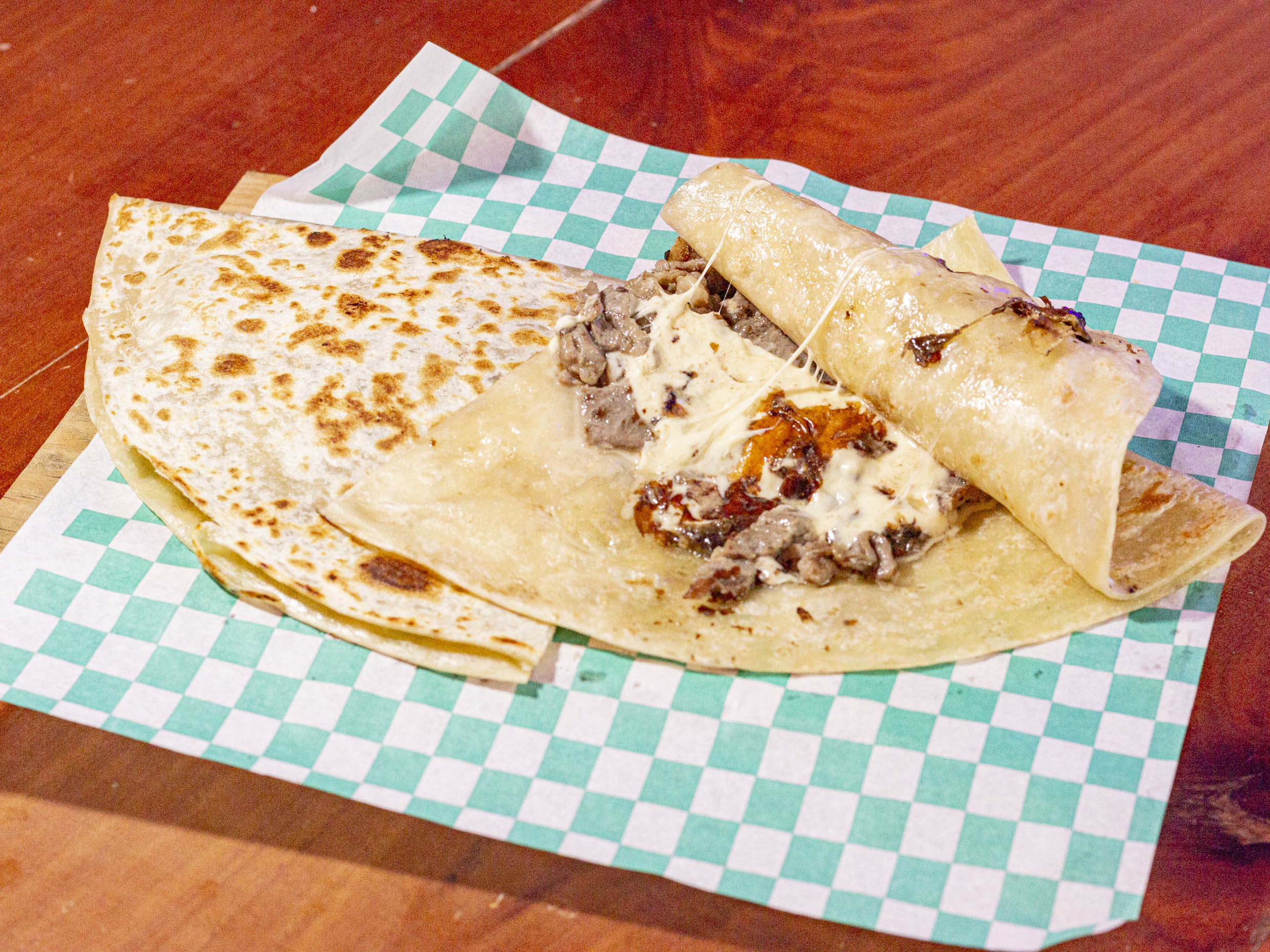 Tortilla de harina jumbo, arroz, frijol, chile asado, cebolla asada y la carne de tu elección.