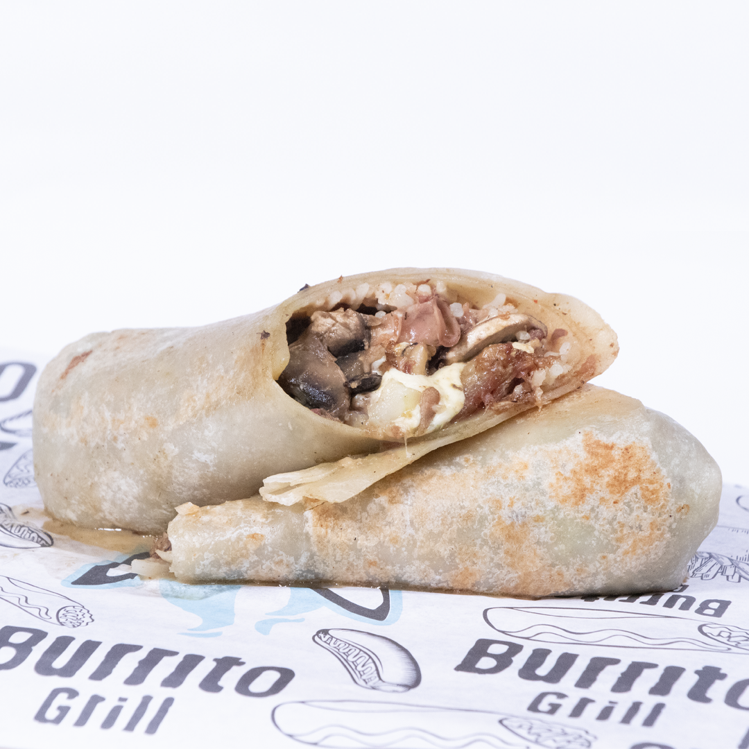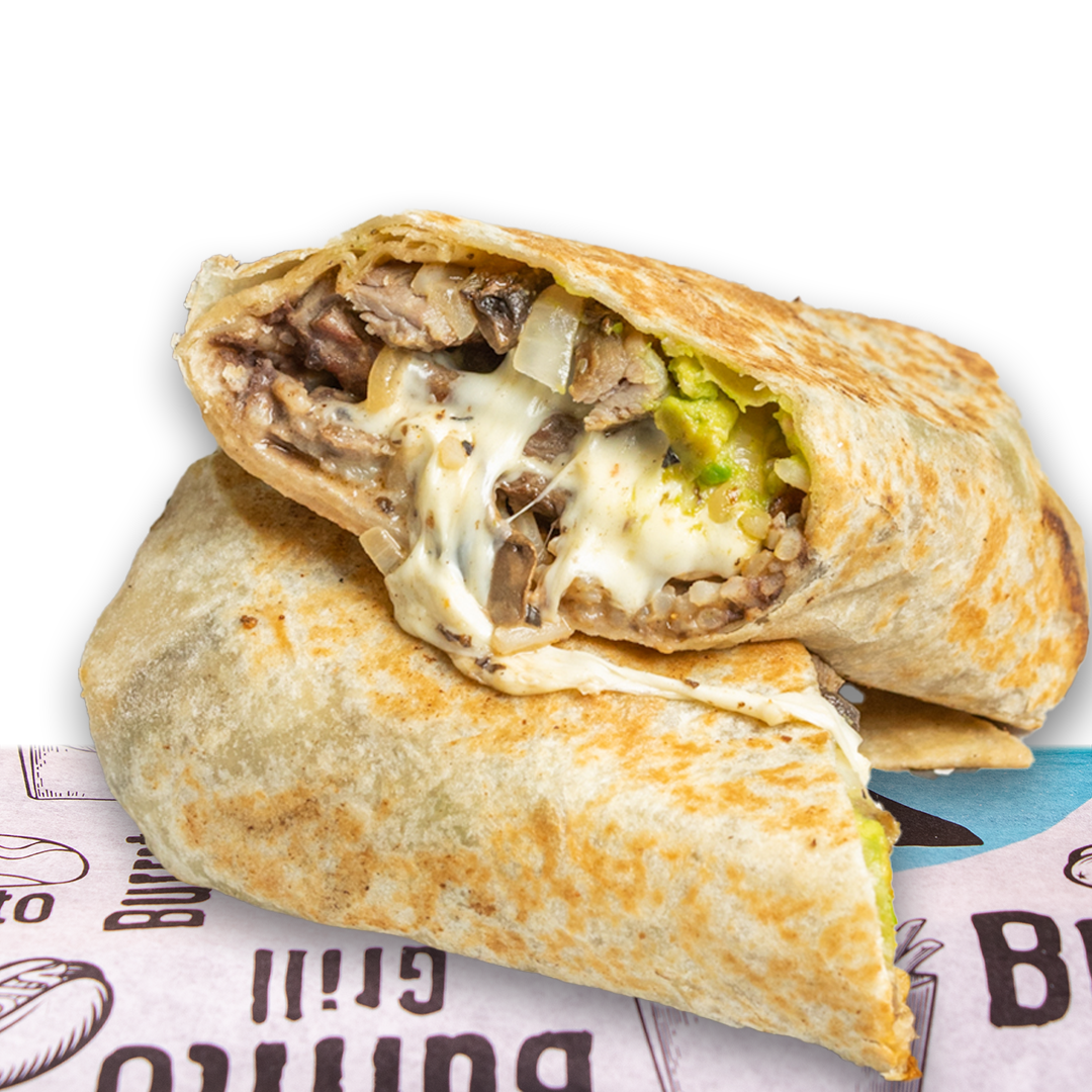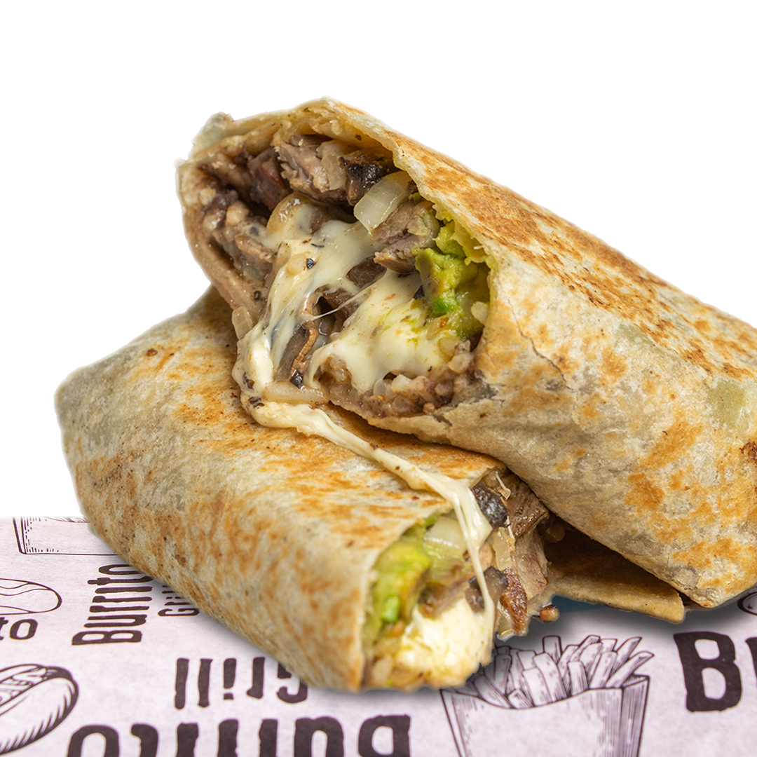 Tortilla de harina jumbo, arroz, frijol, champiñón, cebolla, guacamole, queso oaxaca, aderezo de la casa y la carne de tu elección.