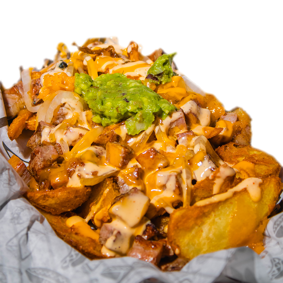 Papas gajo con 180gr de rib eye, aderezo de la casa, guacamole y queso cheddar