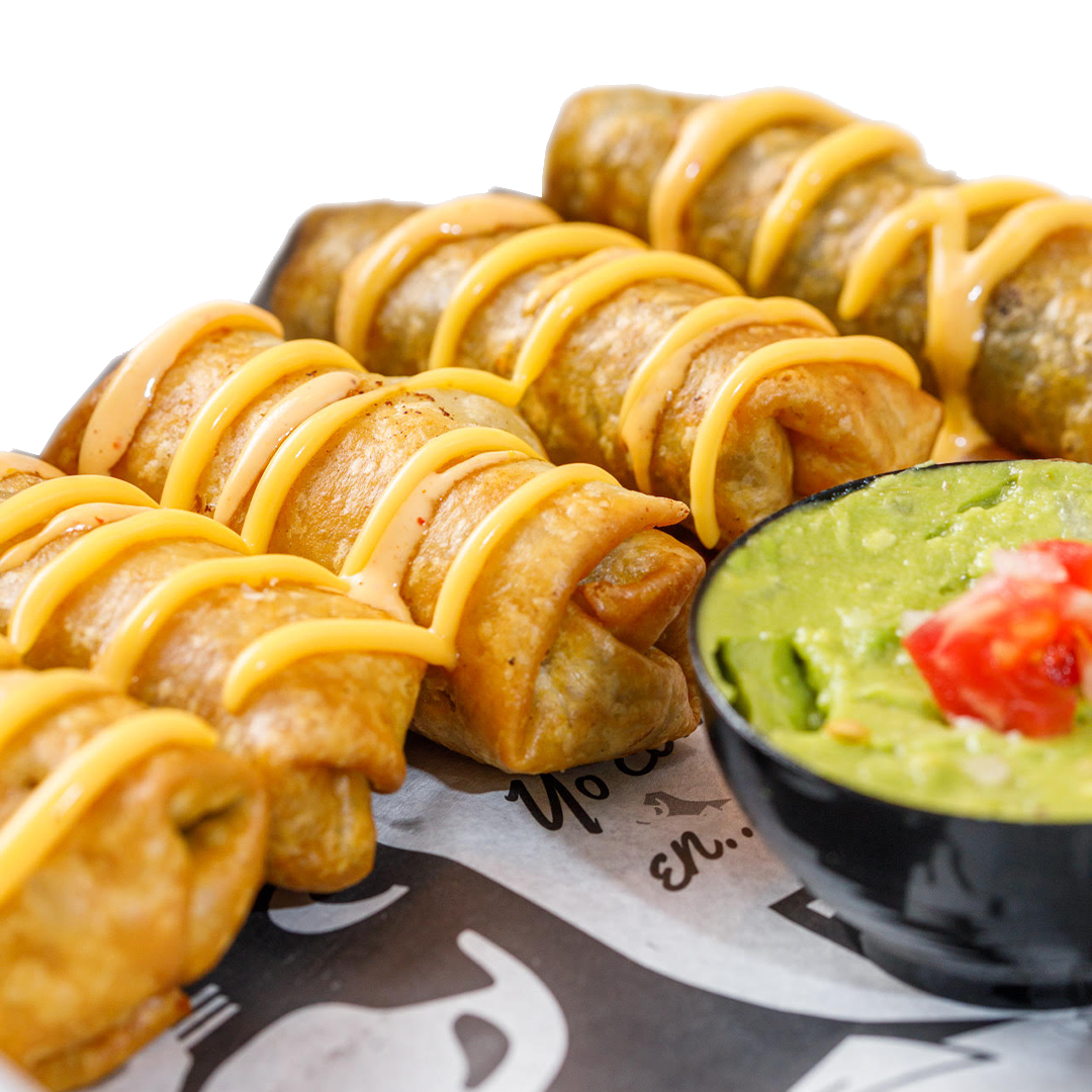 Tortilla de harina jumbo, arroz, frijol, champiñon, cebolla, guacamole, queso oaxaca, aderezo de la casa y la carne de tu elección.