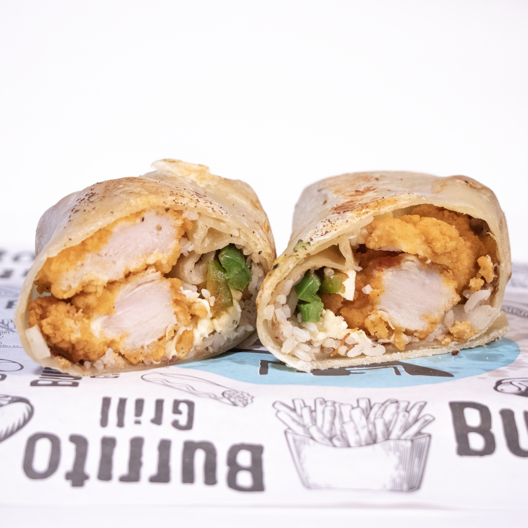 Tortilla de harina jumbo, arroz, frijol, chile morrón, piña, queso gouda , aderezo de la casa y la carne de tu elección.