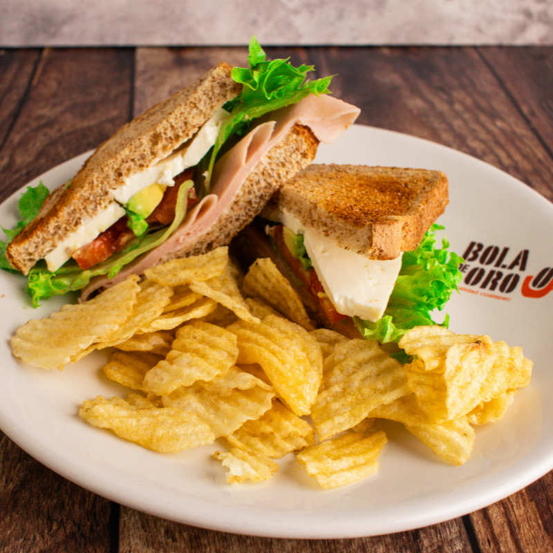 Rebanadas de pan integral con jamón de pavo, queso panela, aguacate, lechuga y tomate. 230 gr..