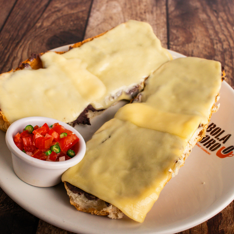 Pan baguetin cortado a la mitad con mantequilla, frijoles, jamón y queso manchego, con su guarnicion de pico de gallo. 320 gr.