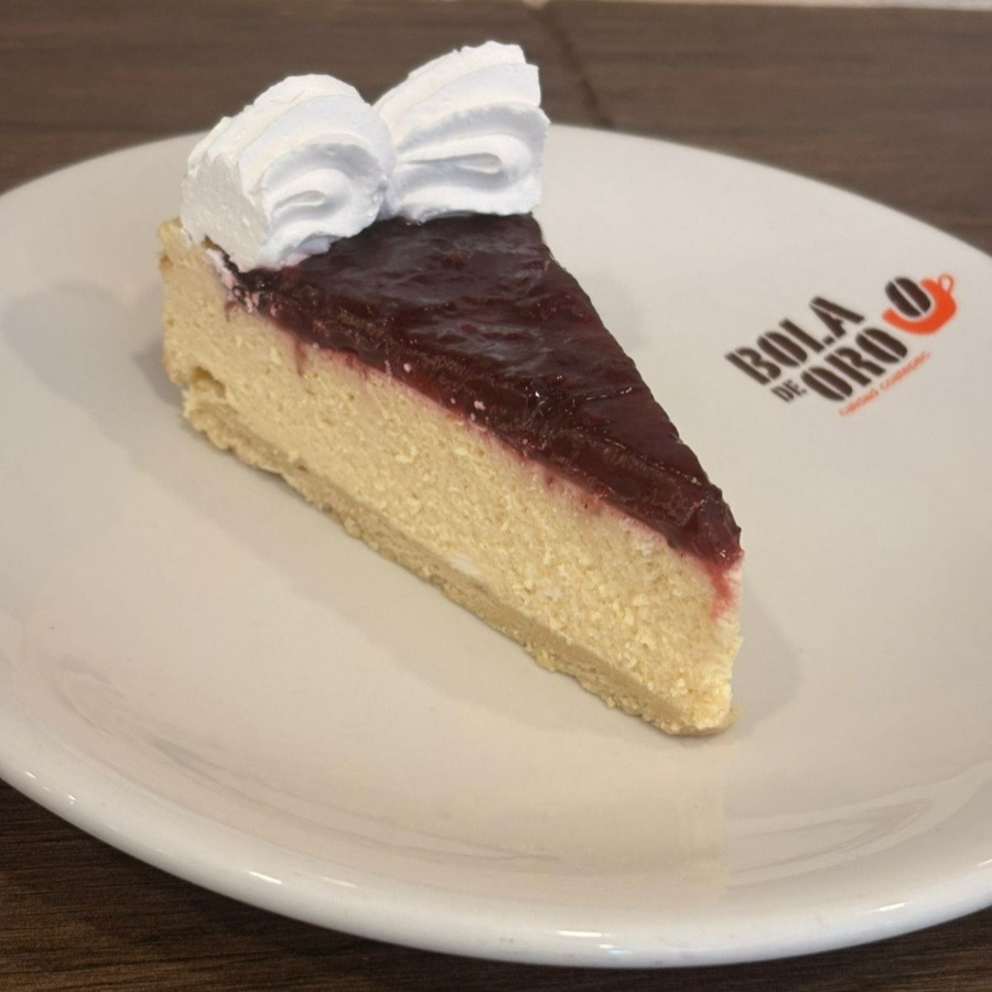 Rebanada de pay de queso natural con cubierta de zarzamora natural y queso crema.