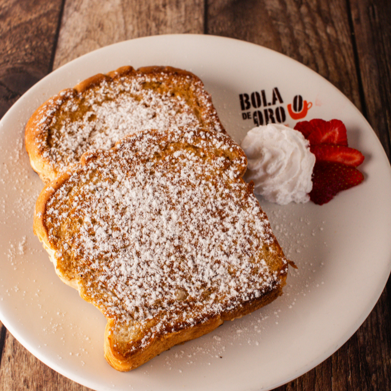 Dos rebanadas de pan brioche dorado con fresa, crema batida, plátano, azúcar glass y salsa a elegir.