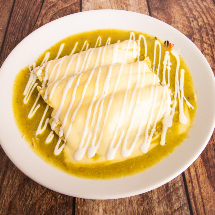 Tortillas dobladas rellenas de pollo, bañadas en salsa a elegir, decoradas con crema, queso, cebolla y aguacate. 350 gr.