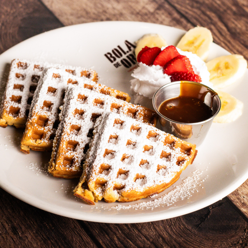 Waffle decorado con fresa, crema batida, plátano y azúcar glass, acompañado de una salsa a elegir.