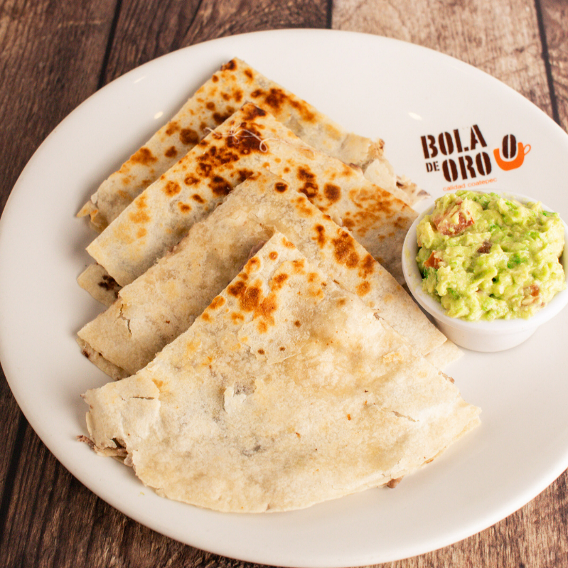 Tortilla de harina con frijoles, arrachera, cecina y queso manchego, acompañada de guacamole. 400 gr.