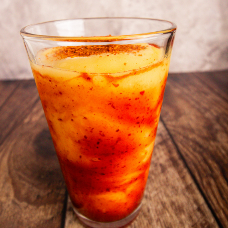 Bebida helada de mango con un toque de chamoy y Tajín.