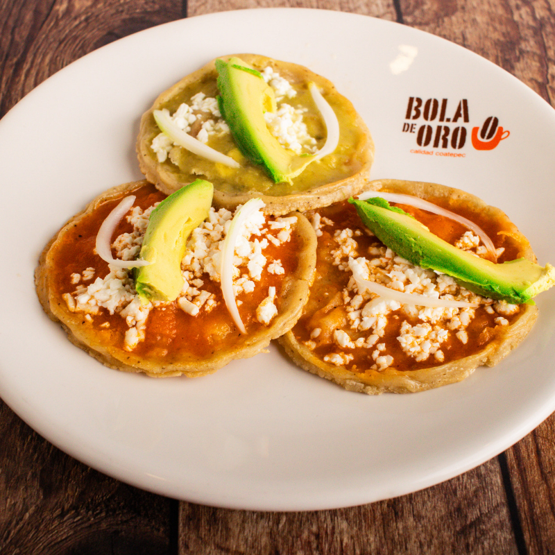 3 piezas de picadas de maíz con salsa roja, verde y mole: una con pollo, otra con huevo y una con chorizo, con cebolla, queso fresco y aguacate.