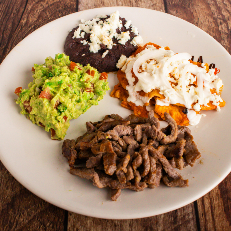 Cecina asada con guarnición de chilaquiles bañados en salsa a elegir (verde o roja), decorados con crema, queso fresco, cebolla y guacamole. Incluye porción de frijoles. 140 gr.