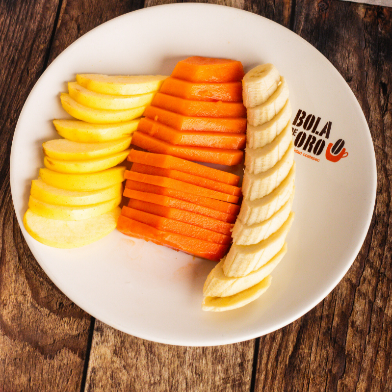 Papaya, manzana y plátanos picados.