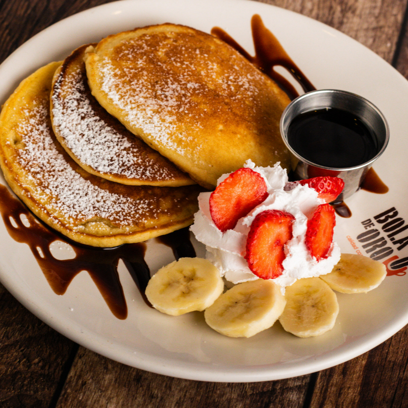 Hot cakes acompañados de fresa, crema batida, plátano y azúcar glass, con una salsa a elegir (3 piezas).