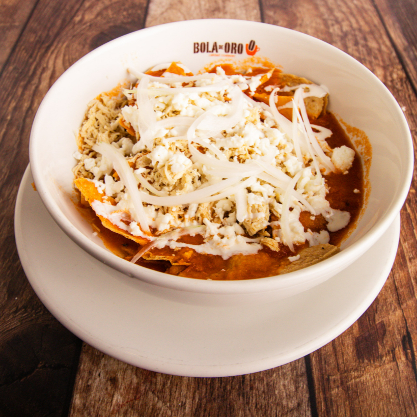 Tortillas dobladas, bañadas en salsa, decoradas con crema, queso, cebolla y aguacate. 350 gr.