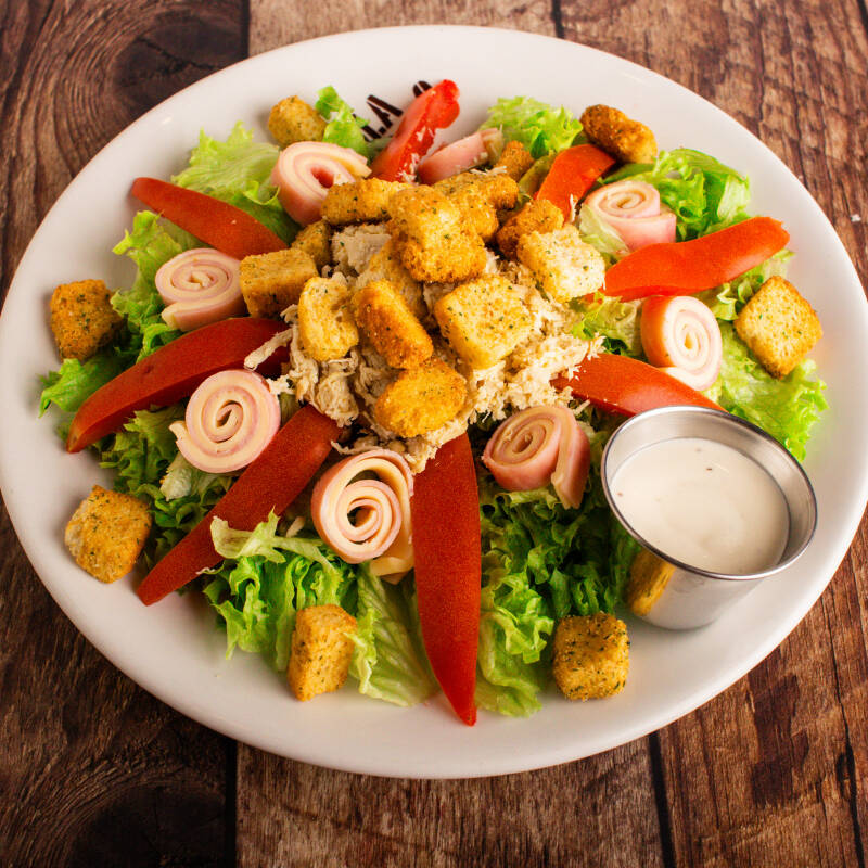 Lechuga troceada con rollitos de jamón, queso manchego, pollo, tomate y crutones, con aderezo de la casa. 240 gr.