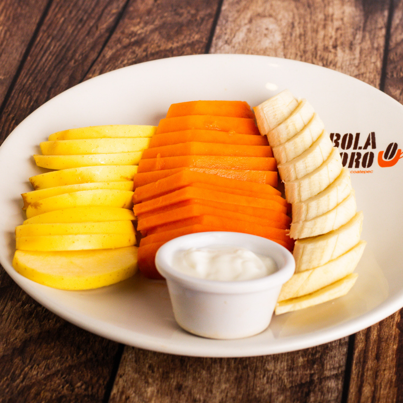 Papaya, manzana y plátanos picados, acompañados de yogurt natural.