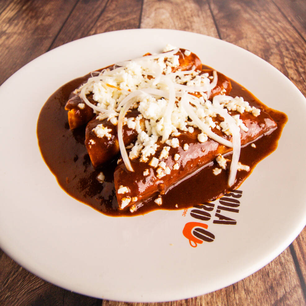 Tortillas dobladas rellenas de pollo, bañadas en mole, con queso, crema y cebolla. 350 gr.