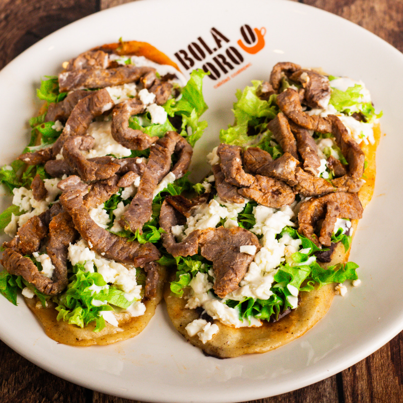 Tortillas dobladas rellenas de proteína a elegir, bañadas en frijoles, decoradas con queso, crema, aguacate y cebolla. 350 gr.