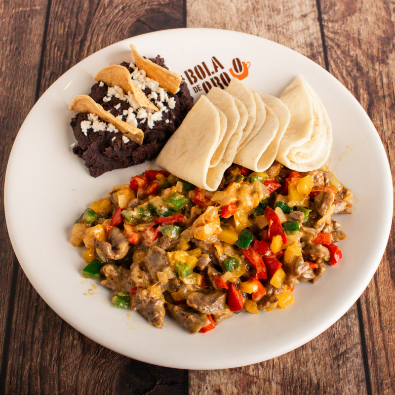 Platillo de arrachera, pimientos y cebolla, salteados al estilo casero y gratinados con queso fundido. Se sirve con tortillas de harina calientes y guarnición de frijoles. 250 gr.