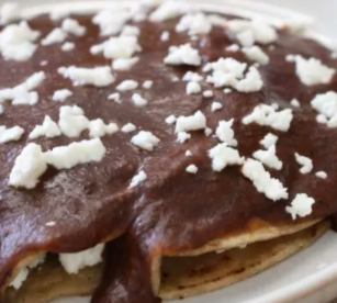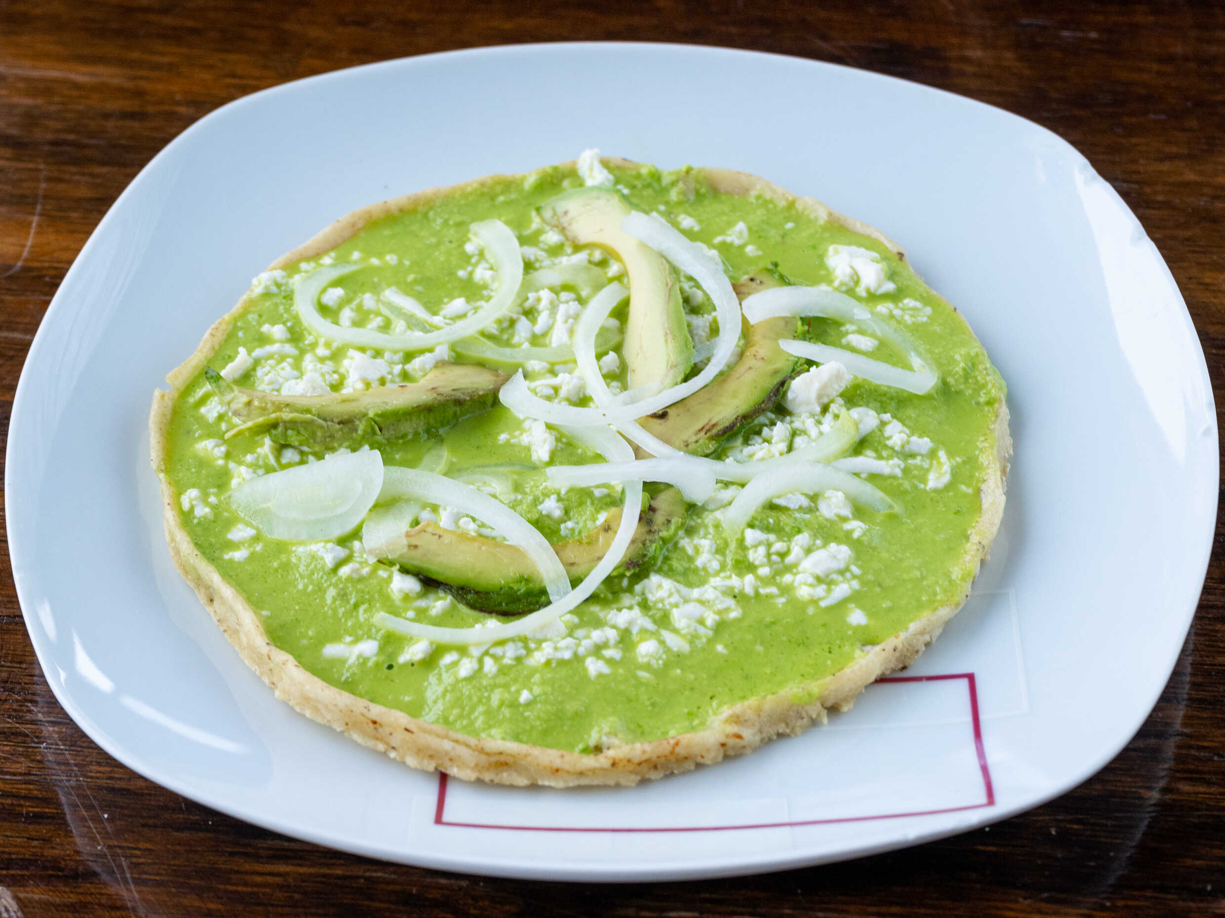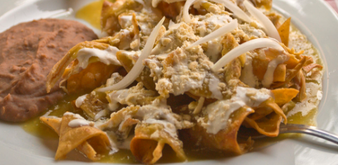 Totopos bañados en salsa con crema, queso, aguacate y cebolla.
