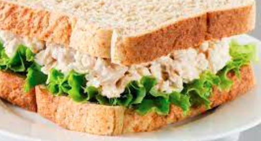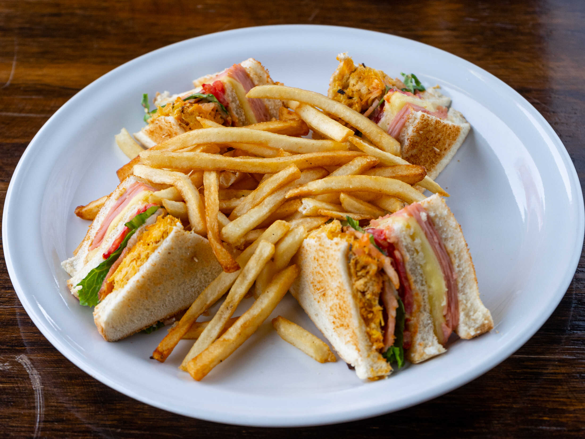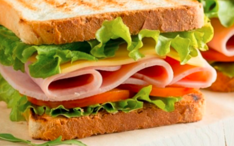 Sándwich tostado de pollo, tocino, jamón, queso gouda, lechuga y tomate. Acompañado con papas o ensalada rusa