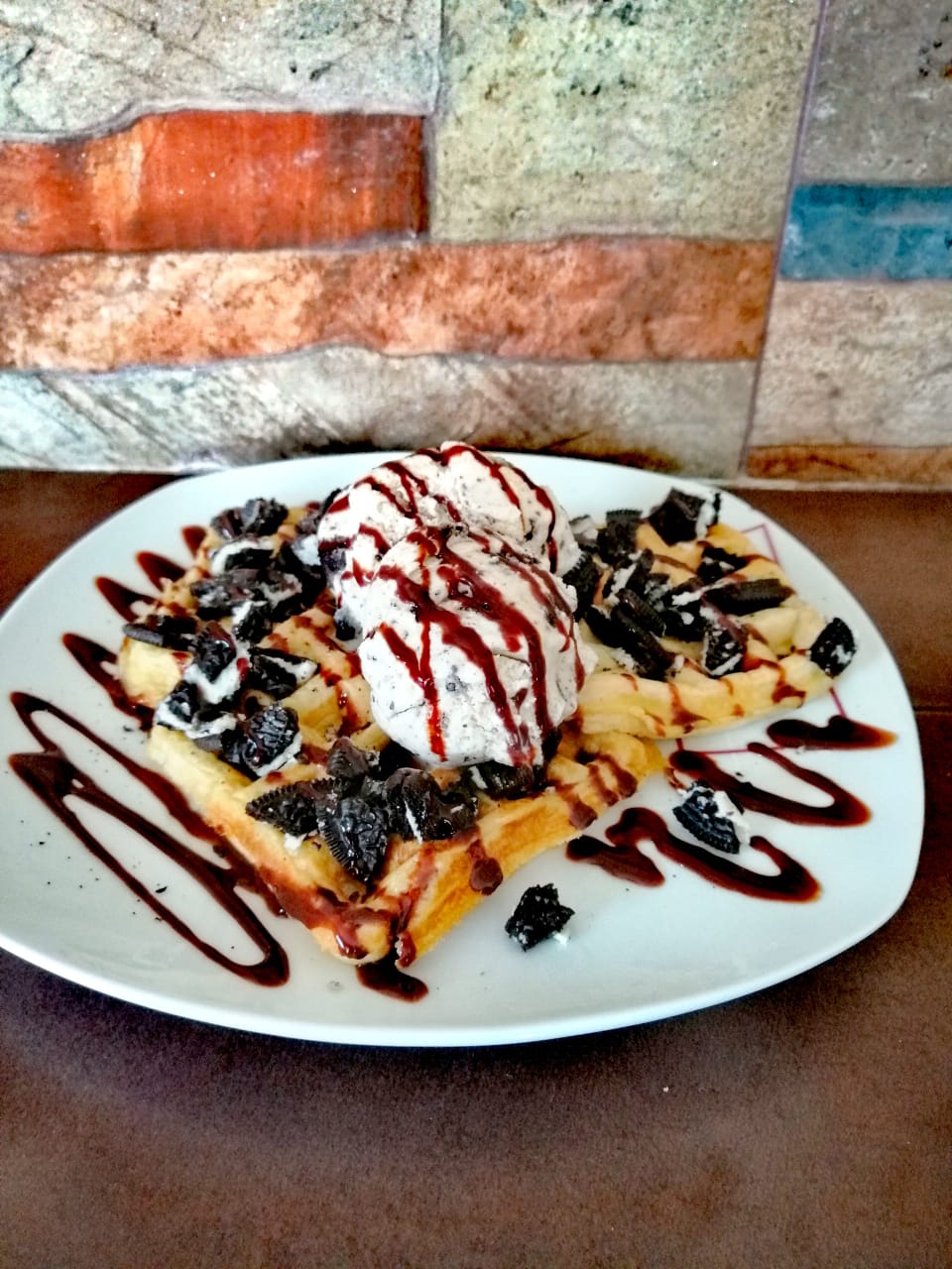 3 piezas. Waffles acompañados de trozos de galleta Oreo y 2 bolas de helado de Oreo. Bañado en chocolate Hershey's.