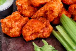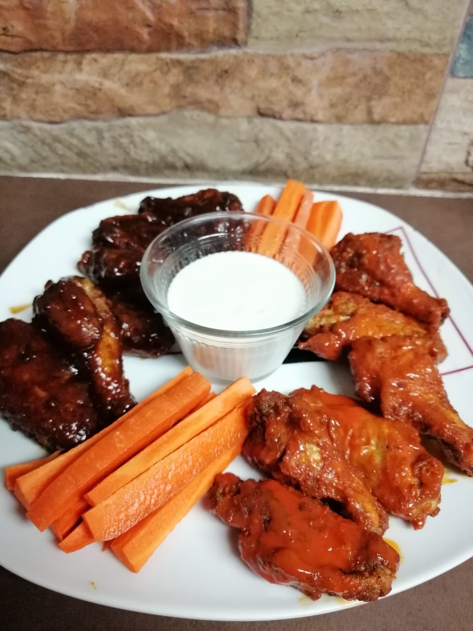 Deliciosas alitas bañadas en tu salsa favorita, acompañadas de aderezo y varitas de zanahoria.