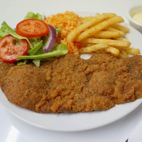 Filete de res empanizado, acompañado con arroz y ensalada