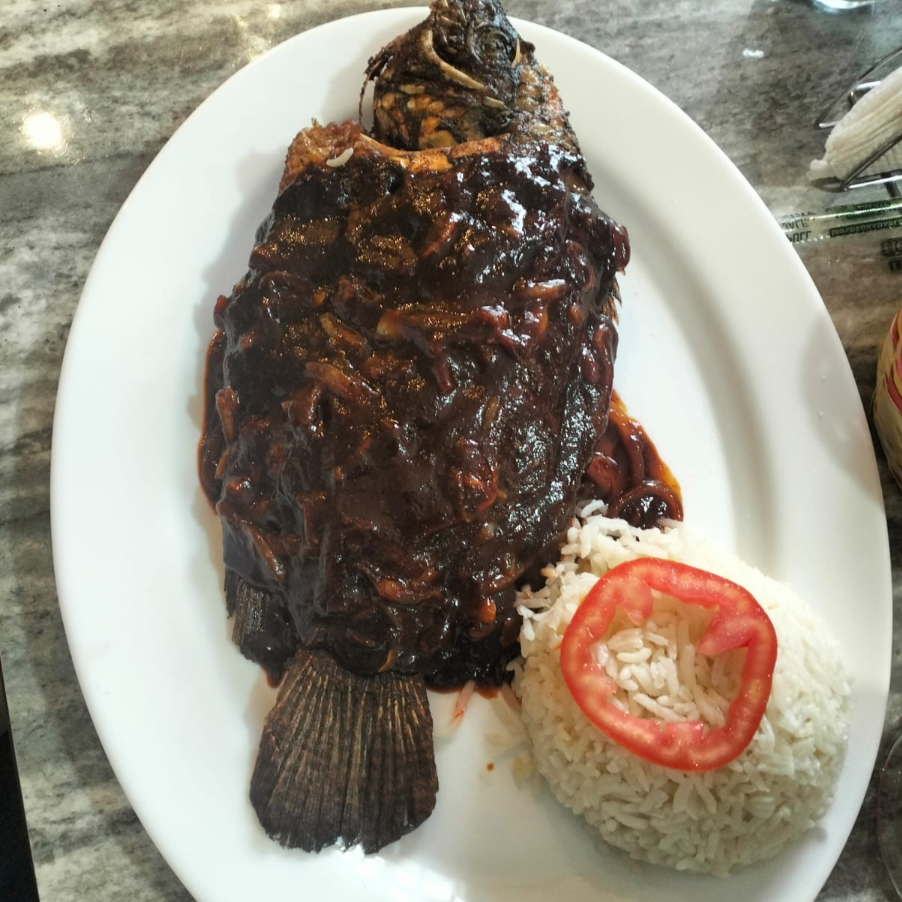 Mojarra salteada con la salsa enchilpayada de la casa, acompañada con arroz