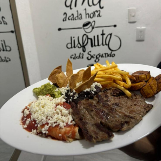 Carne asada acompañada de frijoles,papas, platano fritos y enchiladas.