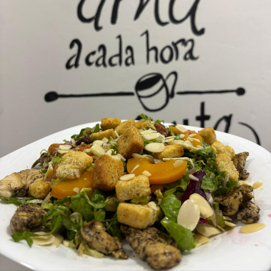 Cama de lechuga orejona, acompañada con arándanos, almendras, nuez, durazno, betabel y pollo a la plancha con un toque de aceite de oliva y aderezo de la casa