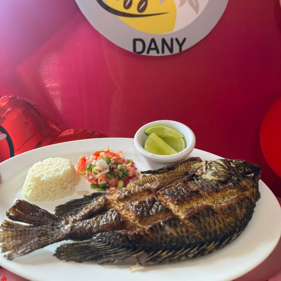 Deliciosa mojarra frita acompañada de arroz, pico de gallo tortillas y limon.