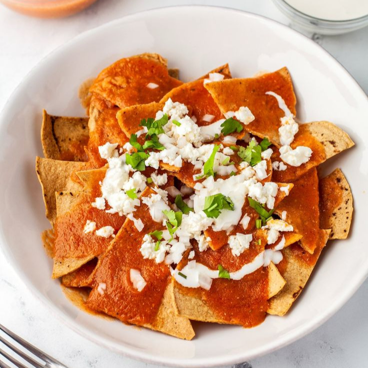 Totopos de maiz, salteados con salsa verde o roja, acompañado de pollo o bistec. Crema, queso y cebolla morada