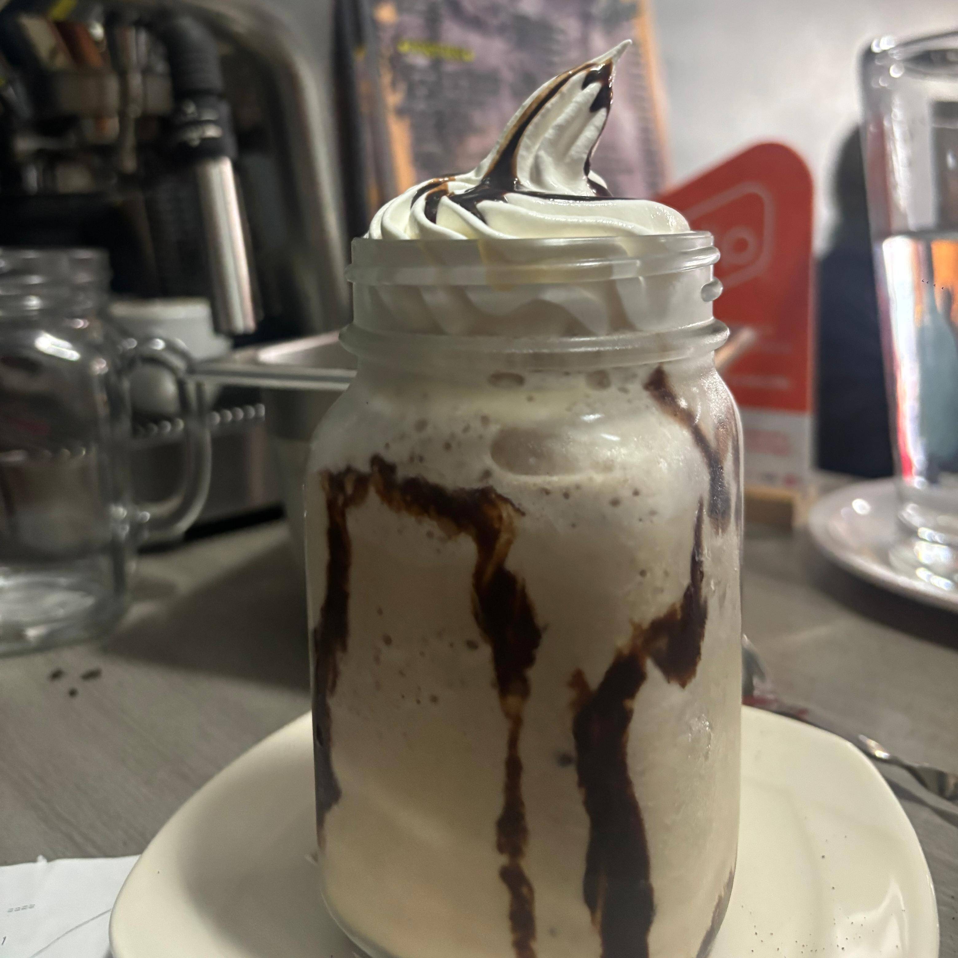 Bebida base café,chocolateleche y hielo.