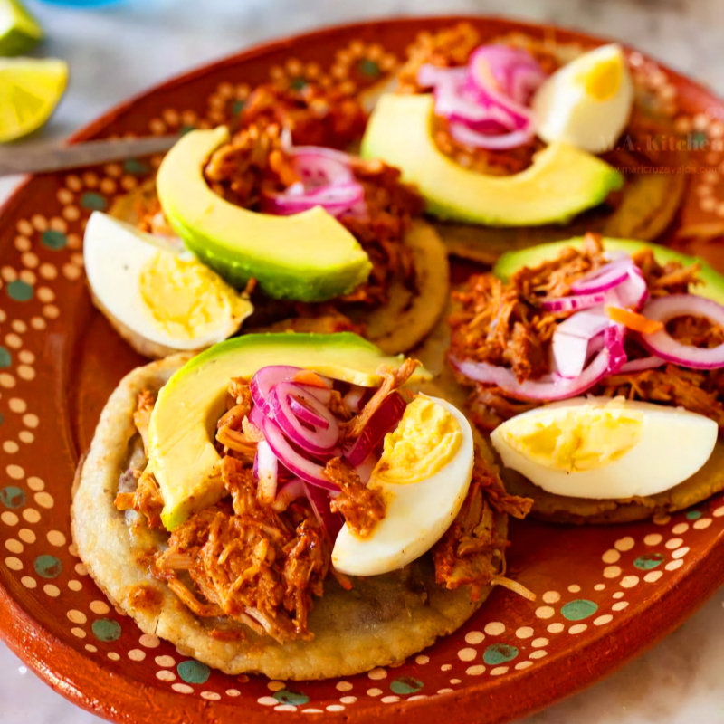Tortilla de maíz rellena de pollo, bañado con frijolitos queso fresco y cebollita morada