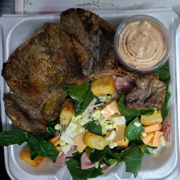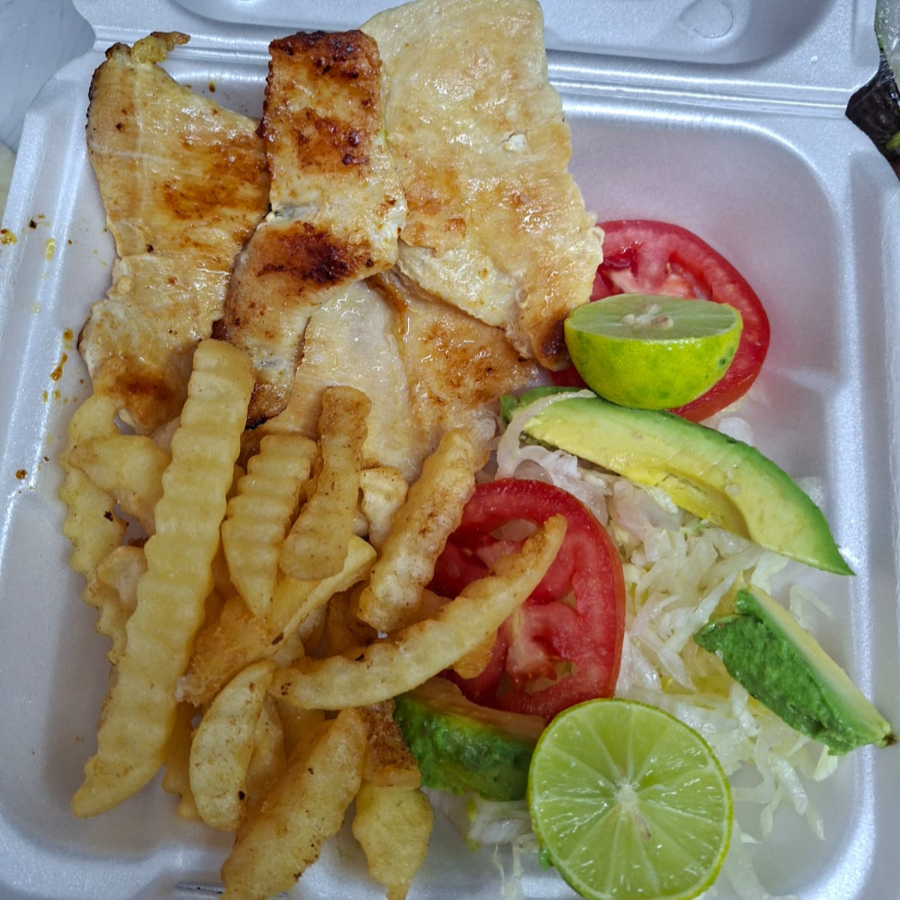 Con ensalada verde, aguacate, tomate y papas a la francesa acompañada con aderezo ranch o capsu o aderezo de mayonesa con chipotle.