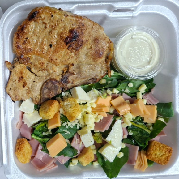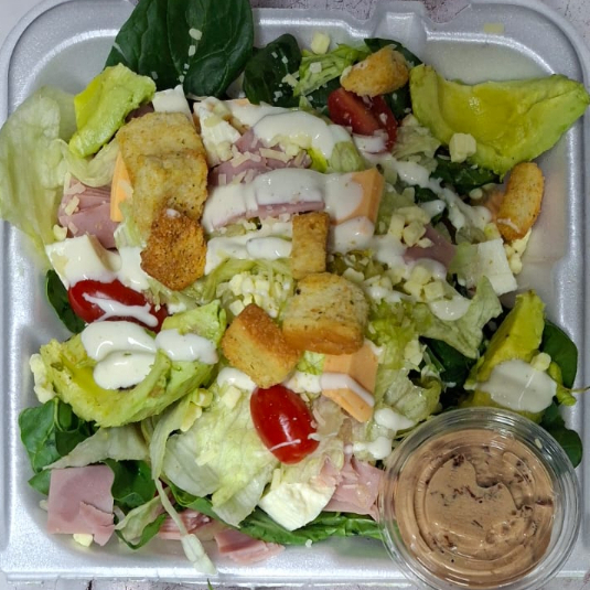 Lechuga, espinaca, crutones, aderezo ranch o aderezo de mayonesa y chipotle, jamon, queso amarillo, queso fresco, queso mozarella, tomate, aguacate.