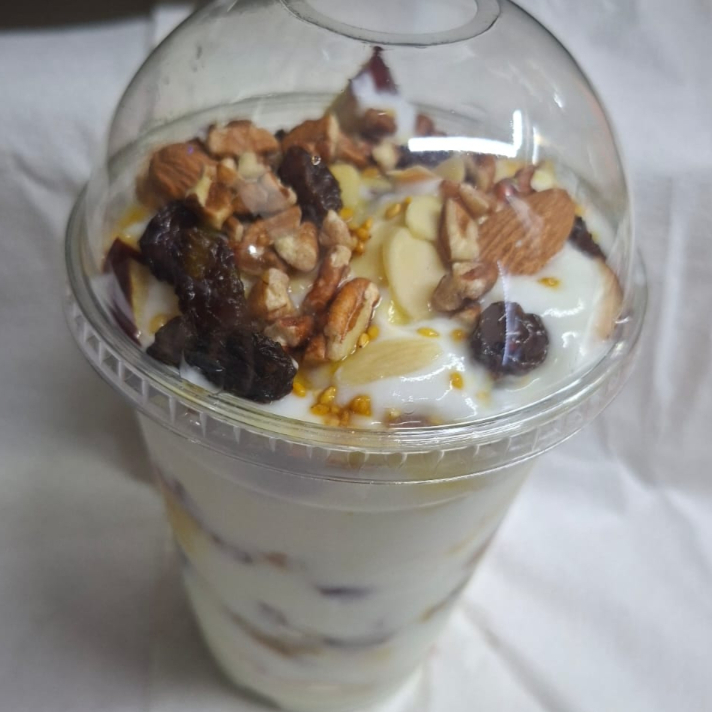 Vaso de 16 onzas de ensalada de manzana con yogur y camas de frutos secos arándano, pasas, nuez, ajonjolí, almendra entera y fileteada.