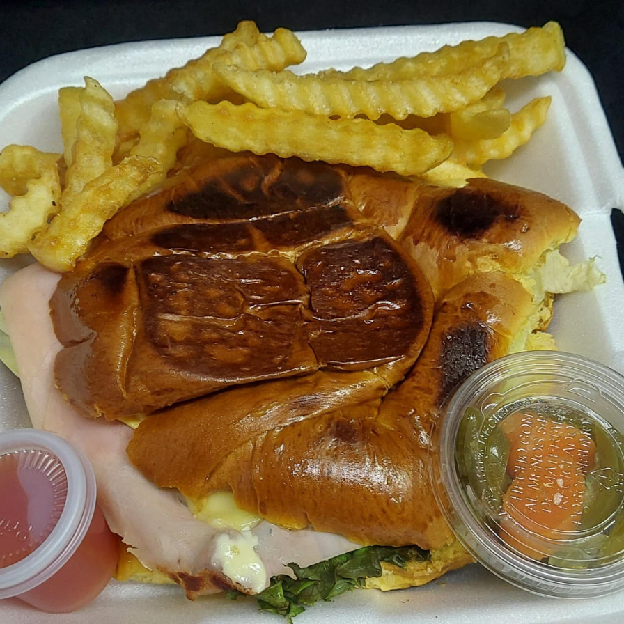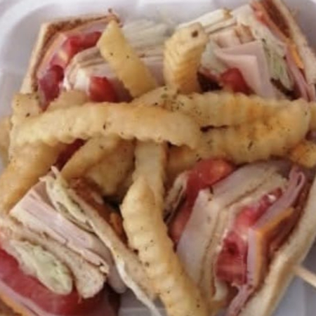 De jamón de pierna, jamón de pavo, queso amarillo, queso manchego, tocino, tomate, lechuga y aguacate acompañado de papas a la francesa aderezo ranch o capsu o aderezo de chipotle con mayonesa.