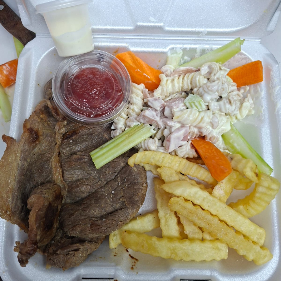 Bistec de res a la plancha con pasta fusil con jamón, apio, zanahoria.