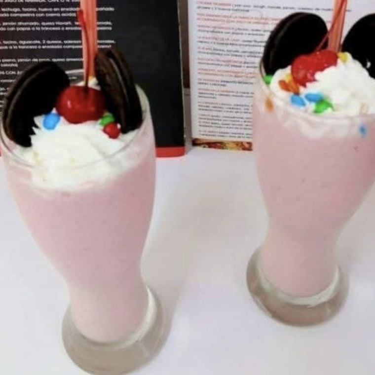 Licuado cremoso de fresas, chocolate o plátano.