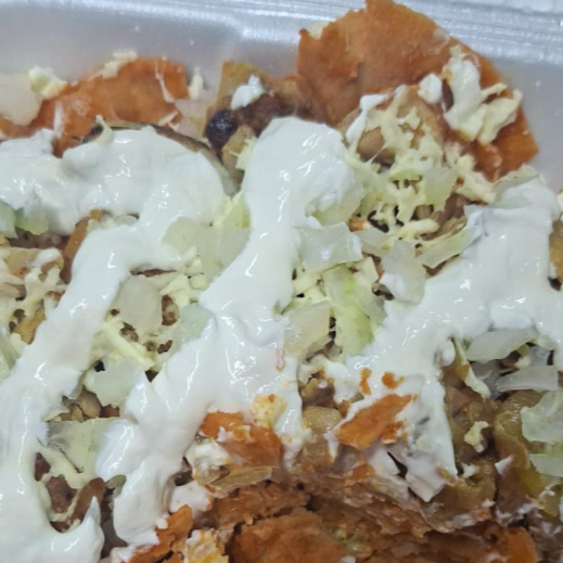 Chilaquiles rojos con bistec a la plancha queso crema y cebolla.