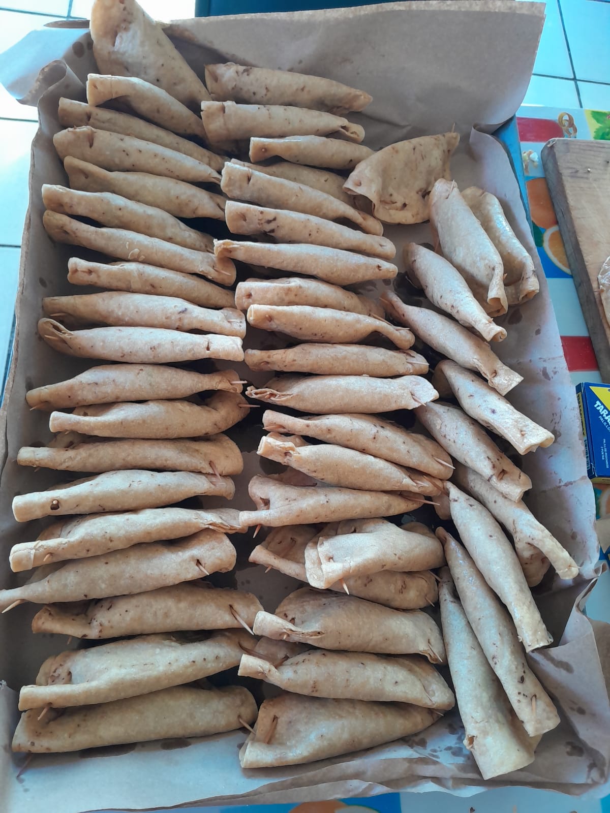 Dobladita de tortilla frita rellena de carne acompañado de salsa verde.
